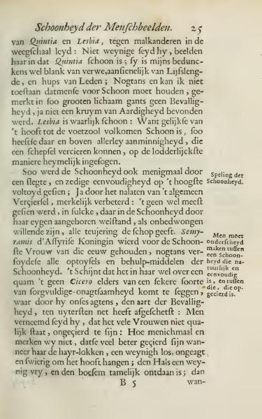 Page 25 compares Quintia and Lesbia, weighing them against each other: He says not infrequently that figures Quintia as beautiful, yet, in my opinion, although she is fair in complexion and elegant in body length and limbs, I cannot agree that one must regard her as truly beautiful. This is because within such a large body there is no grace, not even a crumb of charm. Lesbia, by contrast, is truly beautiful. From head to toe, she is perfectly beautiful and possesses such delicate allure that creatures might be adorned with them in a most subtle and clandestine manner.