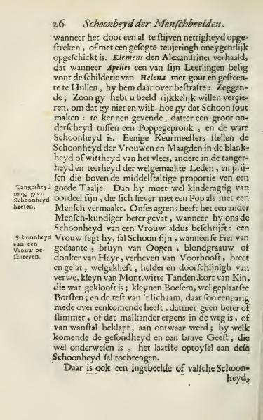 ...Klemens of Alexandria recounted that when Apelles had one of his students work on the painting of Helena with gold and jewels, he reproached him, saying: Son, you desired to embellish your work richly, but you did not understand how to achieve true beauty: thus emphasizing the distinction between superficial ornamentation and genuine beauty. Some arbiters of taste consider the beauty of women and maidens in the fairness or whiteness of flesh, others in the slenderness and delicacy of well-formed limbs, praising those above average proportion of a good figure. However, he who would be so childlike in judgment to amuse himself with a doll rather than a human is mistaken. According to our understanding, another connoisseur of human studies better captured it when describing the beauty of a woman as follows: A woman, he says, will be beautiful if she is noble in stature, with brown eyes, blonde-grey or dark hair, a high forehead, broad face, well-proportioned, clear and transparent complexion, small mouth, white teeth, short chin, slightly cleft; small breast, well-placed bosom; and the rest of the body should be in such harmonious assemblage, such that nothing is better or worse, nor anything obstructs another, or is deemed as deformity. Accompanied by health and a noble spirit which rightly governs, the ultimate refinement will adorn this beauty.
