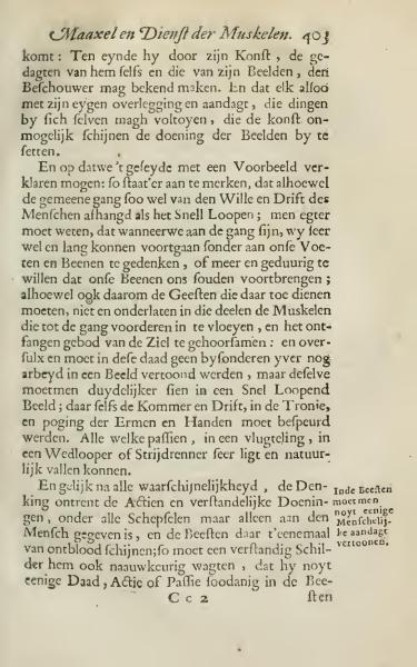 The text discusses how an artist must be able to convey thoughts through skill and concentration. It uses walking and running as metaphors for human will and muscular actions. The artist should carefully avoid depicting animals with human emotions or actions.