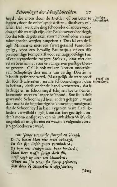 Our young lady cries and complains, That her man no longer pleases her, And that his love has greatly diminished; She cannot think what bothers her; But dear wise one, silently remain still, At first he saw her through love's spectacles: You now see how sharply his nose is cut, For the spectacles of love are now removed.