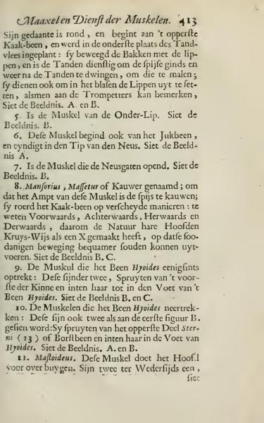 8. Named Masseter or Chewer; because the function of this muscle is to chew food; it moves the jawbone in various directions: forwards, backwards, upwards, and downwards. This is why nature has aligned the heads crosswise like an X, to facilitate such movements more smoothly. See illustration B, C.