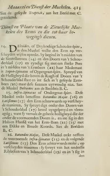 Infra-Spinatus or Lower Ridge Muscle. This muscle pulls down alongside the Rotundus Major (16) and Latissimus (17), moving the arm backward in various ways. It spreads closely under the spine of the shoulder blade (17), broadly spread and fleshy; filling the entire hollow that is under the mentioned spine, and it connects in the neck and head of the humerus (22) (23) with a Thick and Broad Cord. See the illustration B. C.