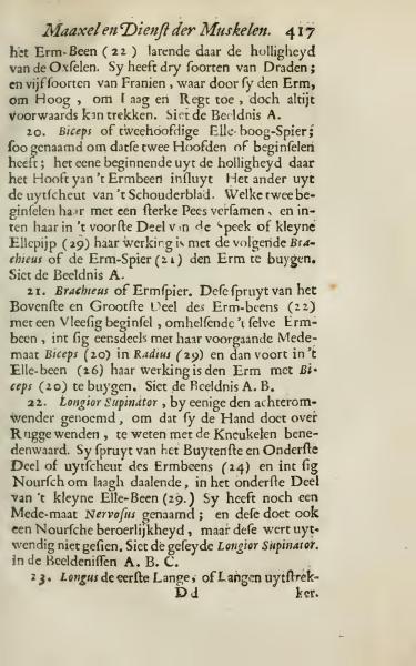 Brachialis or Arm Muscle. This springs from the Upper and Largest Part of the Arm-bone (22) with a fleshy origin, embracing the same Arm-bone, first itself with its preceding Co-associate Biceps (20) in Radius (29), and then continues into the Elbow-bone (26), its function is to bend the Arm with Biceps (20). See Illustrations A. B.