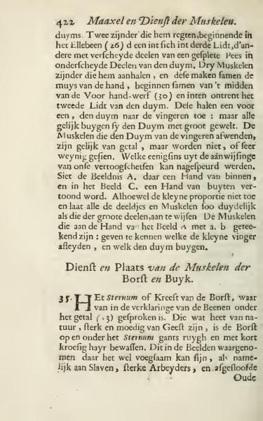 Thumb. There are two muscles that straighten it, starting in the humerus (26) and one inserted in the third joint, the other with various parts of a split tendon in different parts of the thumb. There are three muscles that pull it, and these together make the fleshy base of the hand, starting from the middle of the palm (30) and inserted around the second joint of the thumb. These pull one after the other, bending the thumb with great force towards the fingers. The muscles that turn the thumb away from the fingers are equal in number, but are not or are very little seen. Which can be ascertained somewhat from the indications of our sketches. See Picture A, where a hand is shown from inside, and in Picture C, a hand from outside. Although the small proportion does not allow to clearly show all the parts and muscles as clearly as those of the larger parts, the muscles that are at the hand of the Picture a marked with a. b. indicate which pulls the small finger aside, and which bends the thumb.