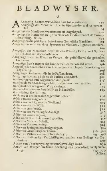 This is a table of contents from a book on human studies, detailing various topics related to human actions, expressions, and emotions. Subjects include the proportion and portrayal of the human form, how features are affected by emotions, and different types of actions and expressions for drawing and art. The text gives insight into understanding human behavior in art, focusing on things like expression, teaching, and the impact of different emotional states.