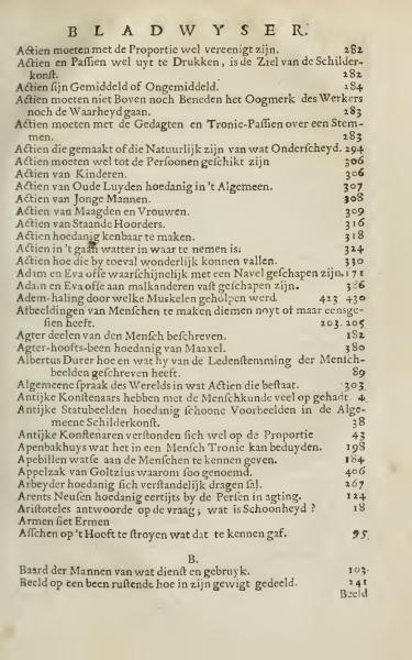 This is a table of contents discussing various aspects of depicting human figures and actions in art. It covers topics such as proportion, expression, and suitability of actions according to different demographics like children, older people, and women. It also mentions historical references like Albertus Durer and questions regarding the representation of iconic figures such as Adam and Eve.