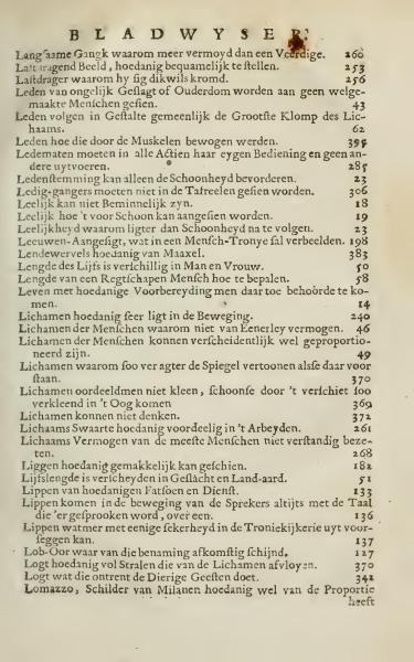 The text is an index or contents of a book that explores various topics in human figure design and anatomy. It subjects range from the movement of muscles and the proportion of the body to the perception of beauty and ugliness. Pages also discuss the role of light, body positioning in art, and specific elements like facial features and vertebrae.