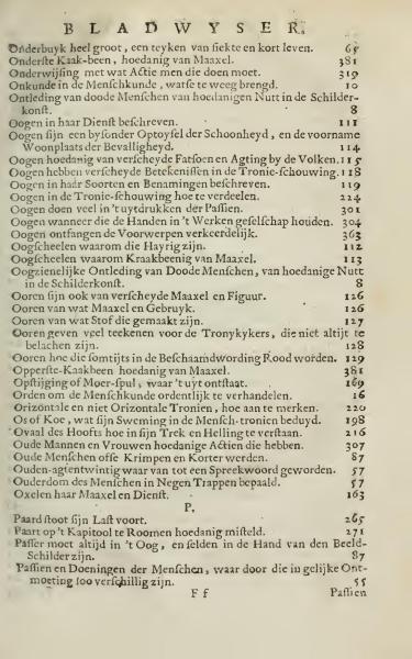 The text provides an index or table of contents from a book focused on various aspects of human anatomy and expression, particularly in their artistic representation. It covers topics such as the significance of the eyes and ears, the role of facial features in conveying emotion, and the anatomical study necessary for artistic depictions of humans. The contents range from anatomical details to philosophical considerations of human form and emotions.
