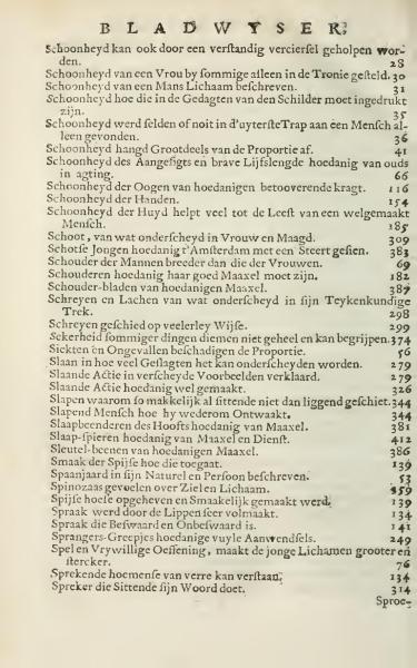 The text is an index from a book that discusses various aspects of human beauty and anatomy, exploring topics like the beauty of the eyes, hands, and skin, as well as the effects of proportion. It includes discussions on artistic representations of emotion, such as crying and laughter, and considers the effects of illness and accidents on proportions. The text also covers topics like the broader shoulders of men compared to women, and the peculiar mention of a Scottish boy in Amsterdam.