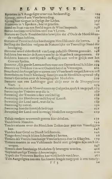 This page from a table of contents lists various topics concerning human studies, such as anatomy and artistic figure representation. It includes discussions on the origin of freckles, the importance of preparation for jumping, differences between statue figures and living beings, and how to cure stuttering. Additionally, it touches on aesthetics in artists’ facial studies and the variation in colors of women's nipples.