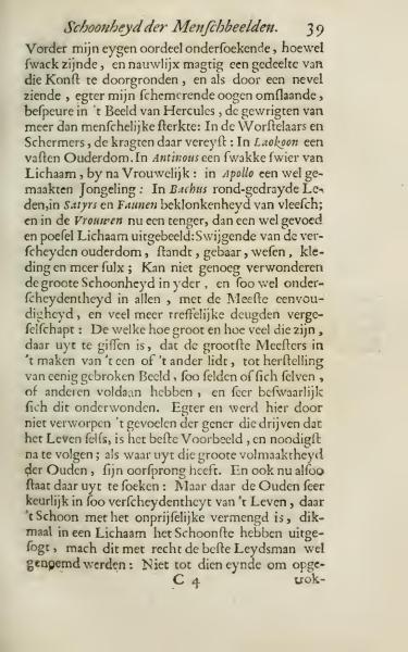 Examining my own judgment, though weak, and barely understanding a part of that Art, and as if through a mist seeing, yet turning my dimming eyes, I perceive in the Image of Hercules, the joints of more than human strength: In the Wrestlers and Fencers, the strength is required there: In Laocoon a steadfast Age. In Antinous a faint gracefulness of Body, nearly Feminine: in Apollo a well-made Youth: In Bacchus round-turned Limbs, in Satyrs and Fauns solidity of flesh; and in Women now a slender, then a well-nourished and supple Body depicted: Reflecting on the various ages, stance, gesture, being, clothing, and more; I cannot wonder enough at the great Beauty in each, and equally the distinction in all, accompanied with the greatest simplicity, and many more commendable virtues: Which how great and many they are, is to be guessed from this, that the greatest Masters in making one or another part, in restoring any broken Image, seldom or hardly ever satisfied themselves or others, and very difficultly ventured this. Yet it was not rejected the sentiment of those who drive that Life itself, is the best Example, and most necessary to follow; as whence the great perfection of the Ancients, has its origin. And even now, it is appropriate to seek from this: But where the Ancients very precisely in such diversity of Life, where Beauty is mixed with the priceless, often in one Body have sought the most Beautiful thing, this can rightly be well named the best Guide: Not with the aim to be exaggerated.