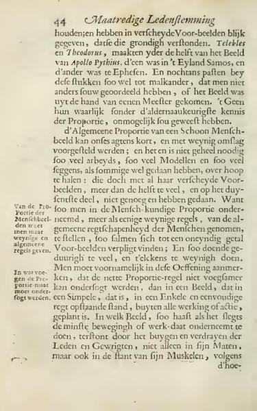 There have been various examples that clearly show they understood it thoroughly. Telekles and Theodorus, each crafted half of the statue of Apollo Pythius, one was on the Island of Samos, and the other was at Ephesus. Yet, these pieces fit together so well that it would seem as if the statue had come from the hand of one master. This would not have been possible without their precise understanding of proportion. In terms of the general proportion of a beautiful human figure, it can be presented concisely and with little complication. It is not entirely necessary to gather as much labor, models, and commentary as some have done, who, even with all their varied examples, have done more than half too much, yet still not enough. For when one ventures into the study of human proportion, more than a few general only rules taken from the common correctness of humanity are necessary, as they find themselves compelled to a potentially infinite number of examples. Doing so causes too much strain and too little progress. One should chiefly bear in mind in this exercise that the precise rule of proportion can only be fittingly examined in a statue set in a simple, single, upright position, devoid of action. In such an image, as soon as it attempts to perform even the slightest movement or action, the bending and twisting of limbs and joints, not only in their size but also in the positioning of the muscles, according to ...