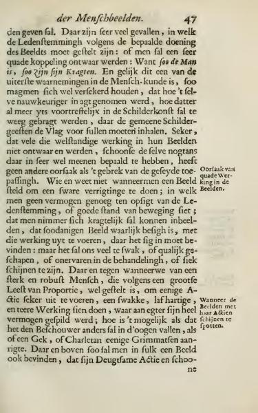 There are many instances in which the arrangement of the limbs, according to the specified action of the figure, must be correct; otherwise, a severe mismatch will be detected: As the person is, so are his strengths. And as this is one of the most important observations in human studies, one can be assured that the more precisely this is taken into account, the more excellence will be brought about in the art of painting, where common artistic minds will have to admit their limitations. Certainly, many who were not aware of the satisfactory expression in their figures, even though they thought they had determined it well, have no other reason than a lack of proper application of principles. Who does not know when creating a figure for a heavy task, in which one does not see enough ability concerning the configuration of the limbs, or good posture of movement, that it is impossible to convincingly imagine that such a figure is truly engaged in that action as it should be; rather, it will appear to us very weak, poorly shaped, inexperienced in handling, or sick. In contrast, when we see a strong and robust person, proportionally well-formed, performing a weak, timid, and delicate action, where his entire ability was completely wasted; how could it be otherwise than that the observer sees it differently, as if a fool or charlatan were making some grimaces. Moreover, one will find in such a figure that its virtuous action and beautiful-