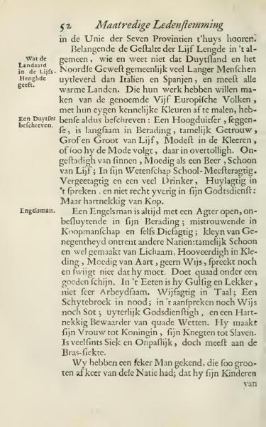 An Englishman is always open-minded, indecisive in deliberation; distrustful in business and even thievish; modest in prosperity compared to other nations; fairly handsome and well-built in body, proud in dress, courageous in disposition, and desiring wisdom, not holding his tongue when he should. He does evil under a guise of good. In eating, he is gluttonous and fond of delicacies, not very industrious. Effeminate in language; a coward in trouble; he speaks neither wisely nor foolishly; outwardly religious, and a stubborn guardian of unjust laws. He sets his wife as queen and his servants as slaves. He is often sick and unfit, mostly with gout.