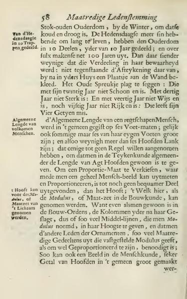 The text discusses the division of a person's life into ten-year segments, suggesting an ideal lifespan of 100 years, with analogous proverbs about age and wisdom. It also outlines the ideal proportions of a well-proportioned human, emphasizing six-foot measurements and using the head as a unit of proportion similar to architectural modulus. It notes common practices in drawing and sculpture regarding human proportions.