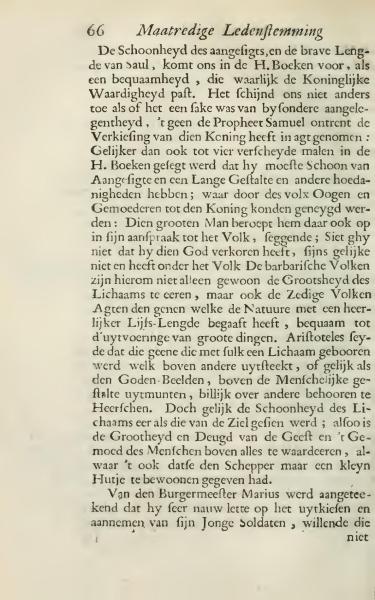 The beauty of Saul's appearance and impressive height is presented in the Holy Scriptures as suitability befitting royal dignity. It seems to us as if it was an issue of special significance, which the Prophet Samuel took into account regarding the election of this king. Likewise, it is stated four times in the Scriptures that he needed to be handsome in appearance and of tall stature with other attributes. For this reason, the people's eyes and hearts could be inclined towards the king. That great man also references this in his speech to the people, saying: Do you not see that God has chosen him, there is none like him among the people. The barbarian peoples were therefore accustomed not only to honor physical greatness but also among virtuous peoples who revere those whom nature has endowed with more excellent body length, suitable for achieving great deeds. Aristotle said that such individuals born with bodies that surpass others, or are like the divine images, ought rightfully to rule over others. However, just as the beauty of the body was seen as superior to that of the soul, so is the greatness and virtue of the spirit and the courage of human beings valued above all, though it is also said that the Creator has given them just a small hut to dwell in. Mayor Marius was noted to be very precise in electing and accepting his young soldiers, wishing not to...