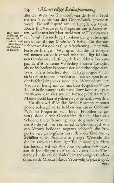 Image: The most noticeable difference found from the Breast-Nipple to the end of the Lower Abdomen: The rest depended on the Length of the Lines. However, the Female Proportion of 9 Views, which corresponds to the Male figure of 10 Heads: And also a length of 7 1/2 Heads is, pleases us best among all his Models. Therefore, we intended to apply that after his Drawing. We believe that those who will bother to view the same, can easily judge that both regard themselves in terms of the General Division of their Length, as well as the specific Proportion of the subordinate Parts in their width, by the added Measurements and Numbers explaining adequately, so that no broader Description is needed. For whether the Female figure is less troubled with Teaching Rules and Measurement Lines than it could be, we believe that everything can be seen and completed from the Discourse-Sketch of the Male figure. And although the Antique Image-Makers believed they had good reason to give the Goddess Vesta the Proportion of seven Heads; they judged this Measurement as fitting for the great Mother of the Earth, and thus concluded the Majesty of a Woman: yet they did not adequately consider that Proportion to other Goddesses, Sybils, or Prophetesses; Knowing that they needed a more sensual and graceful Language. Therefore, the aforementioned Lomazzo wants to offer the Youths and Maidens, a certain Refinement, which stems from the Paternal narrow-bounded Age, and the Maternal or Feminine grace, ...