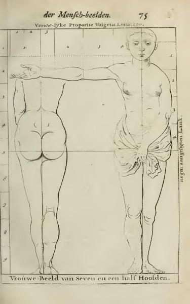 The text provides an illustration of female human proportions based on the teachings of Lomazzo, focusing on a measurement from head to toe equating to seven and a half heads. It serves as a guide for artists studying human anatomy. This method of using heads as a measure is a classical technique in figure drawing.