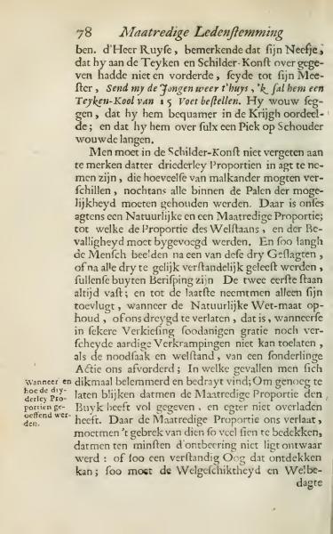 In the art of painting one should not forget to note that there are threefold proportions to consider, despite how much they may differ from one another, they must all remain within the bounds of possibility. In our view, there is a natural and measured proportion, to which the proportion of well-being and gracefulness should be added. And as long as human figures conform to one of these three types, or all three reasonably, they will be beyond reproach. The first two are always firm; and to the last, refuge is taken only when the natural order stops or departs, which is when certain atypical or unique circumstances require us to adapt; in such cases, a constraint or tightening can be felt; to show sufficiently that they have adhered to the measured proportion regarding the body, without overloading it. When the measured proportion leaves us, its lack should be concealed as much as possible, so that deficiencies at least do not stand out noticeably: if a wise eye can discover this, so must skill and aptitude compensate.