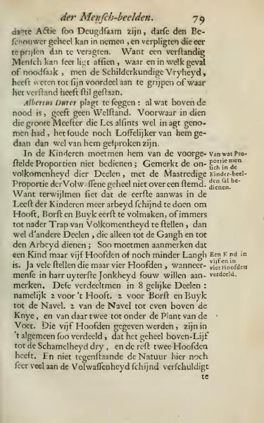 In children, one should not adhere strictly to the proposed proportions; Notice that the perfection of these parts does not completely conform to the moderate proportion of adults. Because it is seen that the first growth in children's age seems to require more work on the head, chest, and abdomen to first complete them, or at least to bring them to a closer step of perfection than the other parts, which only serve for walking and work. Thus, we should observe that a child is only five heads or even less in length. Many even set it at four heads when people want to notice them in their utmost youth. These divisions are into eight equal parts: namely, 2 for the head, 2 for the chest and abdomen down to the navel, 2 from the navel just above the knee, and from there two to under the sole of the foot. The five given heads are generally divided in such a way that the entire upper body to the shamefulness three, and the rest has two heads. And not withstanding that nature here still owes much to the maturity.