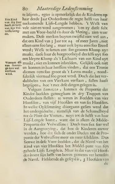 The text discusses the concept of body proportions, emphasizing that children at the age of three have half of their expected adult height. It explains commonly misunderstood concepts of proportional measurement, including how physical features might grow in relation to each other. The work references ideas from Lomazzo regarding the staging of children's development using units of heads.