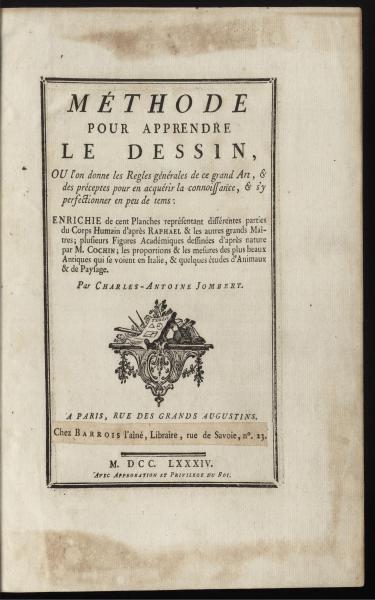 The text outlines a method for learning drawing, providing rules and guidelines to master the art quickly. It includes plates of human anatomy as depicted by Raphael and other masters, along with academic figures by Cochin, and studies of antique statues and landscapes. The book is authored by Charles-Antoine Jombert and published in Paris in 1784.