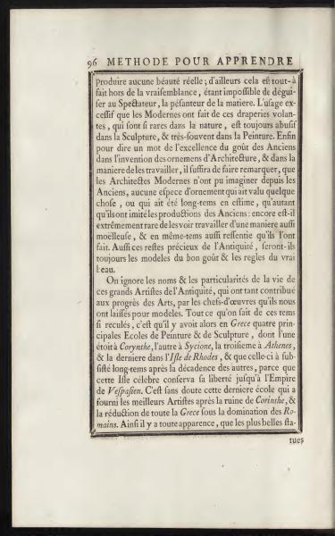 To produce any real beauty; besides, this is entirely outside the realm of plausibility, since it is impossible to disguise the weight of the material to the viewer. The excessive use that the Moderns have made of these flying draperies, which are so rare in nature, is always abused in Sculpture, and very often in Painting. Finally, to say a word about the excellence of the Ancients' taste in the invention of Architecture's ornaments, and in their manner of working them, it is sufficient to note that Modern Architects have not been able since the Ancients to imagine any type of ornament that has been valued, or has gained long-standing esteem, except insofar as they have imitated the productions of the Ancients: it is still extremely rare to see them work in a manner as soft, and yet as refined as the Ancients did. Thus, these precious relics of Antiquity will always be the models of good taste and the rules of true beauty.