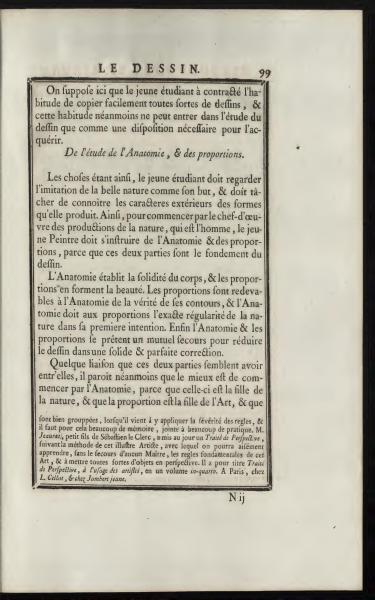 Regardless of the connection these two elements seem to have with each other, it nevertheless appears that it is best to start with Anatomy because it is the child of nature, and proportion is the child of Art. They are well grouped when applying the rigor of rules, for which a lot of memory and practice is needed. Mr. Jeaurat, grandson of Sébastien le Clerc, has published a "Treatise on Perspective," following the method of this illustrious Artist, with which one may easily learn, without any Master's aid, the fundamental rules of this Art, and to place all kinds of objects in perspective. It is titled "Treatise on Perspective, for Artists' Use," in a quarto volume. In Paris, with L. Cellot, and with Jombert young.