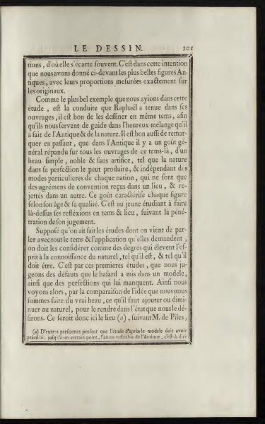 Assuming that one has completed the studies just discussed with all the time and application they require, they should be seen as steps that elevate the mind to the knowledge of nature, as it is and as it should be. It is through these initial studies that we assess the flaws that chance has put in a model, as well as the perfections it lacks. This way, we then see, by comparing the idea we have formed of true beauty, what needs to be added or reduced in nature to render it in the state we desire. Hence, this would be the place (a), according to M. de Piles,