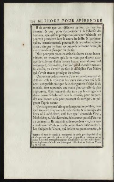 This change, though not impossible, is very rare. Raphael followed the schools and practices of his place of upbringing, just like Leonardo da Vinci, Michelangelo, Jules Romain, and other great painters of those times. They spent their whole lives without reaching a complete and genuine understanding of good coloring. The disciples of Vouet, who were numerous, and a person born for coloring would lack the part for which he was born and wouldn’t acquire what is not proper to him. It is observed that great colorists are formed only in schools where young people are introduced to the brush early; such are the schools of Venice and Flanders.