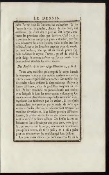 The entire mechanism that comprises the human body moves through the muscles that make the bones, to which they are attached, advance or retract. These muscles are flesh woven with fibers and membranes: they are of different shapes, but they always swell in the middle, and their extremity or tail ends in tendons with which voluntary movements are made. These muscles are placed next to each other on the bones, receive their sustenance through the arteries, and the animal spirits are sent to them by the nerves; thus, when they swell, they shorten and move the limbs in various ways, making them take different forms, and causing bulges or indentations following the variety of their actions. These bulges and indentations are softened by smooth but thick skin, which covers the body completely, rising in some areas more than others, so that there are places where it is hard to recognize the muscles beneath.