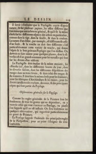 It would be desirable for the landscape artist to copy from nature, and on several sheets, the different effects observed in trees in general, and to do the same with different species of trees specifically, like in the trunk, leaf, and color. The nature of an oak, for example, is different from that of a willow, and the touch should also be different: it's particularly this variety of touch that brings spirit and good taste to the landscapes that are drawn. This should also be applied to some plants, whose diversity is a great ornament for the terraces in the foreground of a painting.