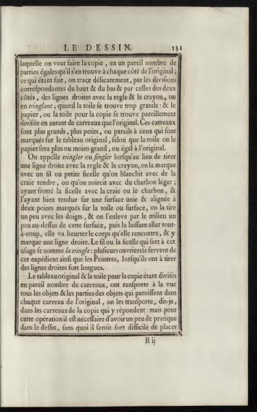 The text describes methods for copying a drawing onto canvas or paper by dividing the surface into a grid of equal parts. It explains the use of a technique called "tringler" or "fingler," which involves marking lines with a chalked string instead of using a ruler and pencil. The importance of practice in drawing is highlighted for successfully mapping objects from the original to the copy.