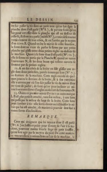 13. Besides this first mirror, there is another marked L. It is smaller and attached towards its middle to a bar that passes through the middle of the top of the box. This bar can be stopped by a screw: it serves to raise or lower the mirror attached to it, so it can be fixed at all sorts of inclinations.