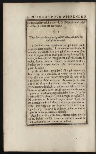 14. When you want to represent an object using this machine, you need to spread a piece of paper on the table, or even better, spread the paper over another board so that it overlaps, and then enclose this board covered in paper within a frame or border, securing it with two rules shaped like a dovetail.