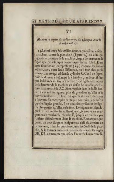 25. The paintings and soft engravings you want to imitate are attached to board F (figure 1) on the side facing the back of the machine, which should be turned so the engravings are exposed to the sun. In this setup, they are shown (14) like other objects, with the sole difference being that the convex glass in cylinder C must be changed. If the aim is to give the print its true size, the distance from the focus to the glass should be equal to half the height of the machine above the table, i.e., half of AC. If one wants to give these same figures more size in drawing than they truly have, the focal distance should be even shorter; conversely, it should be longer if one wishes to represent figures smaller than they are. The required adjustment of the engravings' distance is achieved by moving the board F forward or backward until they appear clearly in the device. Note that when figures are to be moved beyond the back of the device, they must be fastened against side F of the board and turned by passing its bars through the guides DE, DE, so that face F looks toward opening N.