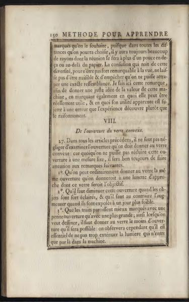...marked as desired, since at all the distances one might choose, there will always be many rays whose convergence occurs more than an inch before or beyond the paper. The confusion arising from this diversity, although not very noticeable to the eye, still causes harm and prevents an exact resemblance from being captured. I make this note here to give a fair idea of the value of this machine, also highlighting in what way it might be genuinely useful and how its apparent utility is susceptible to errors that experience reveals more than reasoning.