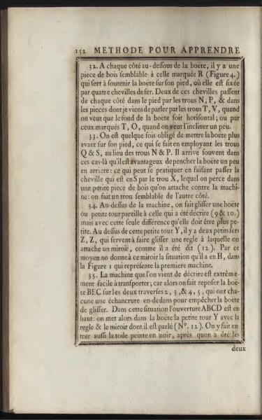32. At each side beneath the box, there is a piece of wood similar to the one marked R (Figure 4), which serves to support the box on its stand, where it is fixed with four iron pegs. Two of these pegs pass on each side through the foot via the holes N, P, & in the pieces I just mentioned through the holes T, V, when one wants the bottom of the box to be horizontal, or through those marked T, O, when one wishes to tilt it slightly.