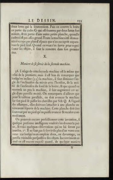 The text provides instructions for using a drawing machine, describing how to set up and adjust the device to properly depict objects. It explains the method to properly use a secondary machine in drawing, including adjusting angles for optimal perspective. Observations are given on improving the invention and maintaining accurate perspectives.