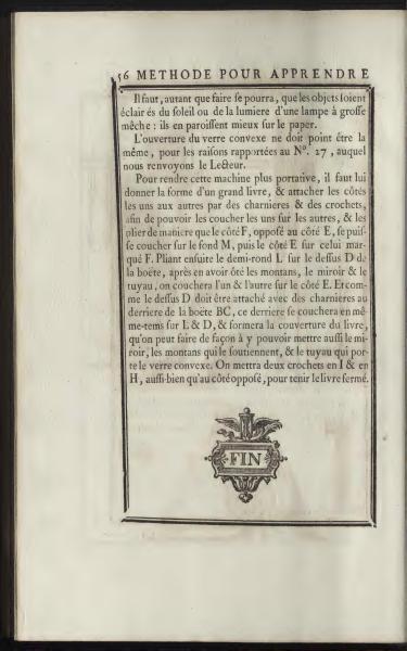 To make this device more portable, it must be given the shape of a large book, and the sides attached to each other with hinges and hooks so they can be folded upon one another, and folded in a way that side F, opposite to side E, can rest on base M, and then side E on side F. Then, fold the half-round L over the top D of the box, after removing the supports, the mirror and the pipe, they will be laid one on the other on side E. And since the top D must be attached with hinges to the back of the box BC, this back will fold on L and D, forming the book cover, which can be made to also hold the mirror, the supports that hold it, and the pipe that carries the convex glass. Two hooks will be placed at I and H, as well as on the opposite side, to keep the book closed.