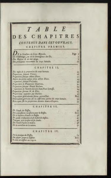 The table of contents outlines chapters on the structure and proportions of the human body, drawing techniques, and observations on artistic practices. It includes references to classical principles by Vitruvius and artists like Albert Durer. Chapters also cover practical methods for studying drawing and specific techniques like drawing with a pencil.