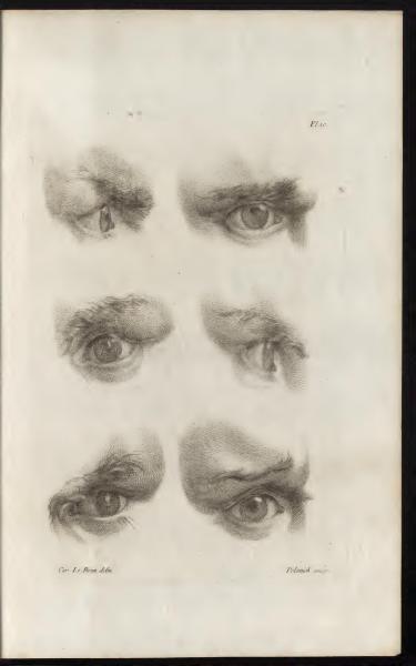 The image has sketches of six different eyes, with artist credits below. It illustrates detailed studies for understanding human expression, showing work by Le Brun and Denisot. This page is likely a part of a broader educational resource on drawing.