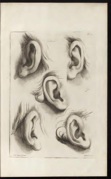 This page features detailed illustrations of human ears to aid in understanding their structure. The sketches are labeled as 'Plate 18' and are created by the artist Cochin. The image serves as a learning tool for artists studying human anatomy.