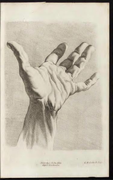The text credits Michel Ange Slodtz for drawing based on the work of Bouchardon, and C. N. Cochin for engraving the piece. These artists are acknowledged for their collaboration in creating the depicted artwork. The terms "delin" and "sculp" are abbreviations indicating the drawer and engraver, respectively.