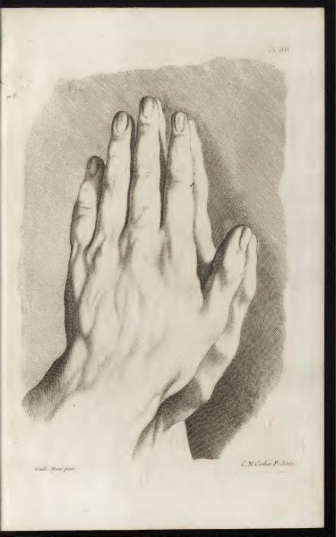 The text on the image attributes the hand painting to Reni and the sculpting work to C. N. Cochin. It reflects the collaborative nature of artistic production in which works by different artists and sculptors are noted. The inscriptions are situating the drawing within a larger context of classical study and learning.