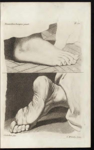 The page contains references to artworks by Domenichino Zampieri and Guido Reni, with engraving by C.N. Cochin. These artists' names are associated with the engraved depictions of feet, suggesting instructional content focused on anatomy and art technique. The engravings serve as educational tools to teach drawing the human form, as part of the book by Charles-Antoine Jombert.