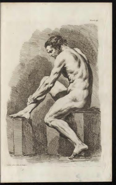 The text identifies the illustration as "Plate 49" and credits Cochin as the artist responsible for painting, drawing, and sculpting the piece. The artwork showcases a classic example of academic figure drawing aimed at studying human anatomy.