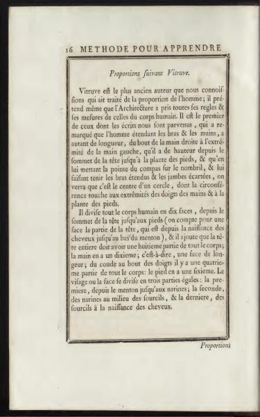 Vitruvius is the oldest author known to us who addressed the proportion of the human body; he even claims that architecture has derived all its rules and measurements from those of the human body. He is the first among those whose writings have reached us to note that when a person extends their arms and hands, they have the same length from the fingertips of one hand to the other as from the top of their head to the soles of their feet. By placing a compass point on the navel and making them hold their arms extended and legs apart, one can see it as the center of a circle, with the circumference touching the tips of the fingers and the soles of the feet.