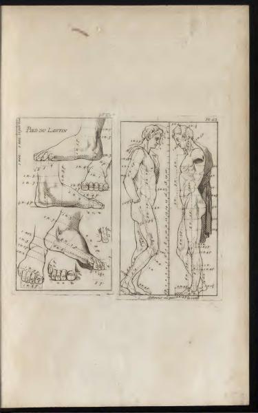 The page features anatomical drawings showcasing the foot and side profiles of human figures, marked with labels and measurements. These illustrations are likely intended as a guide for artists studying human anatomy and proportions.