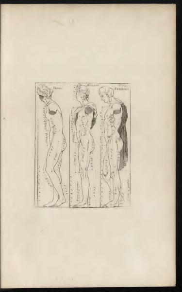 The text identifies the figures in the drawing as Venus, Apollo, and Antinous, classical figures often used in historical anatomical studies to illustrate human proportions. This serves as a guide in the study of human anatomy for artists.